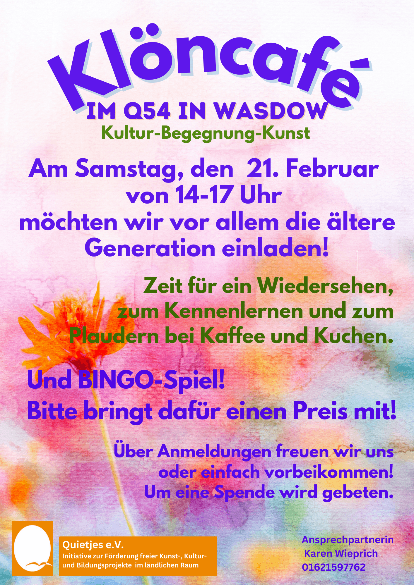 | Samstag jeden 2. Monat | Klöncafé für die ältere Generation im Q54 in Wasdow |