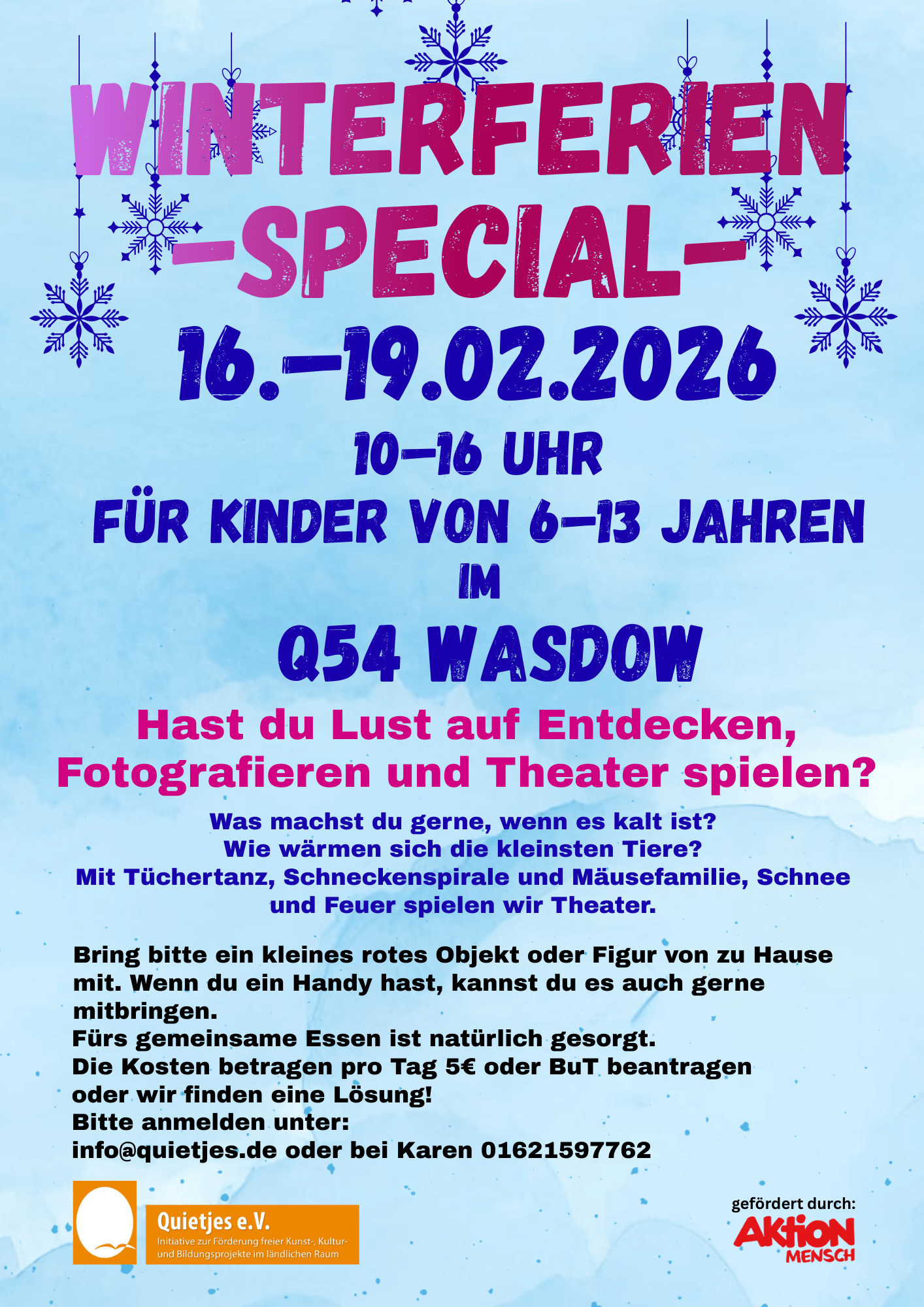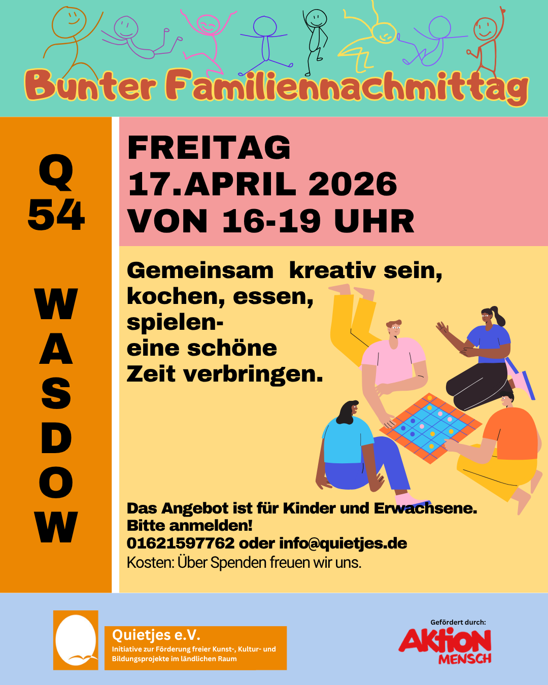 | Freitag 1 x im Monat | Bunter Familiennachmittag ab 15 Uhr -kreativ sein, reparieren, kennenlernen, kochen, essen, spazieren, tanzen... im Q54 Wasdow |